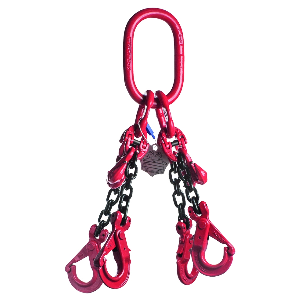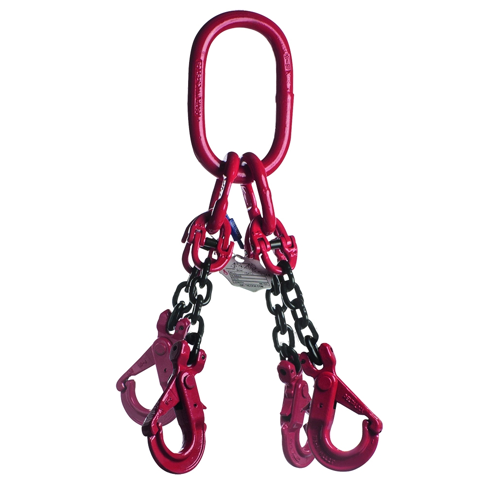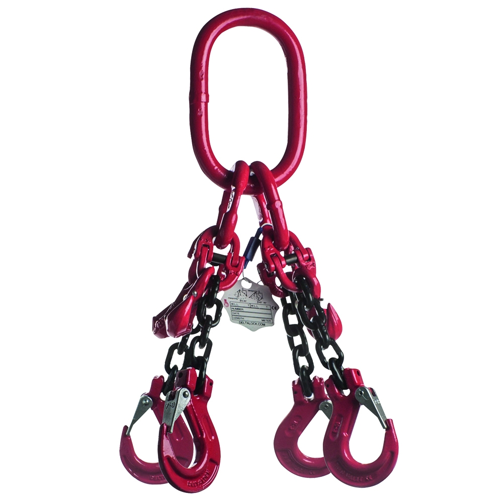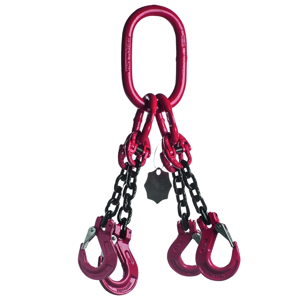 Eigenschappen: Ketting 10mm Veiligheidshaak WLL gebaseerd op 0 tot 45° Lengte / Hijshoogte: 4 WLL Ton: 8
