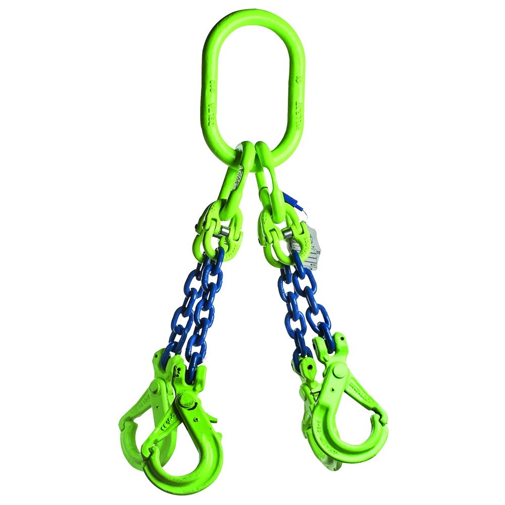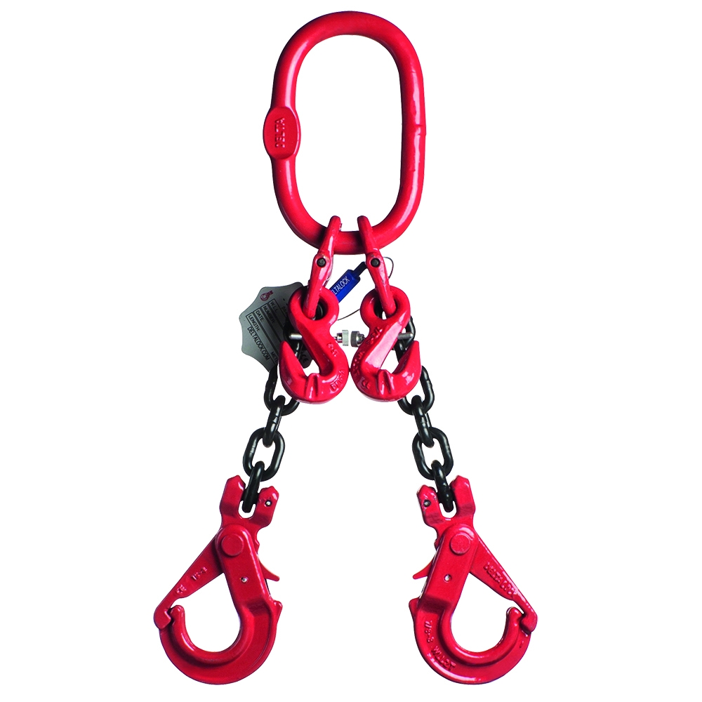 Eigenschappen: Ketting 10mm Veiligheidshaak WLL gebaseerd op 0 tot 45° Lengte / Hijshoogte: 2 WLL Ton: 8